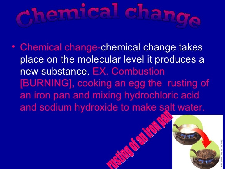 Examples of chemical changes include combustion (burning), cooking an egg, rusting of an iron pan, and mixing hydrochloric acid and sodium hydroxide to physical changes are concerned with energy and states of matter.